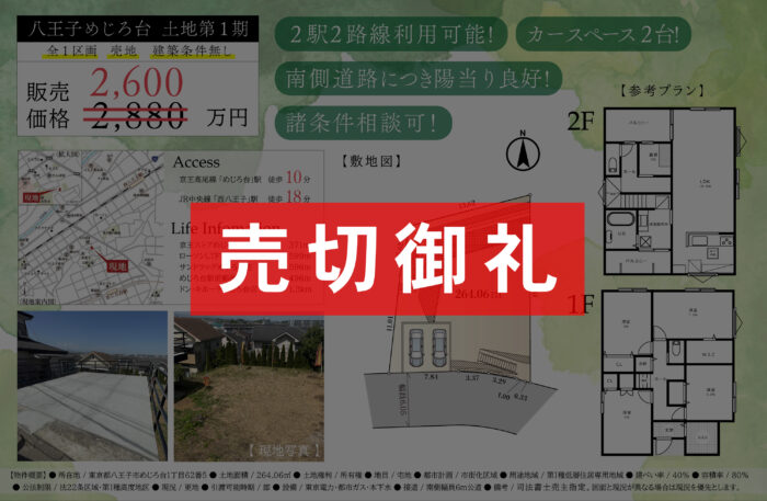 物件概要|所在地:東京都八王子市めじろ台1丁目62番5|土地面積:264.06㎡|土地権利:所有権|地目:宅地|都市計画:市街化区域|用途地域:第一種低層住居専用地域|建ぺい率:40%|容積率:80%|公法制限:第1種高度地区|現況:更地|引渡時期:即|設備:東京電力・都市ガス・本下水|接道:南側幅員6m公道|備考:司法書士売主指定。図面と現況が異なる場合は現況を優先とします。